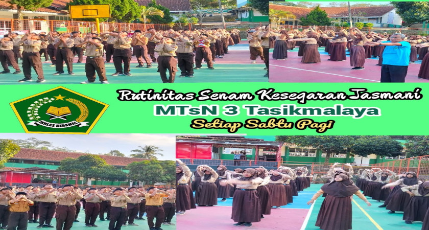 Untuk mendukung proses pembelajaran yang sehat dan memberikan penyegaran pada seluruh komponen serta untuk mengembangkan bakat dan melatih siswa dalam berolahraga, aktifitas senam kesegaran jasmani merupakan salah satu program bidang kesiswaan MTsN 3 Tasikmalaya kepada seluruh siswa untuk mengikuti aktifitas senam kesegaran jasmani setiap hari Sabtu pagi sebelum KBM dimulai.
